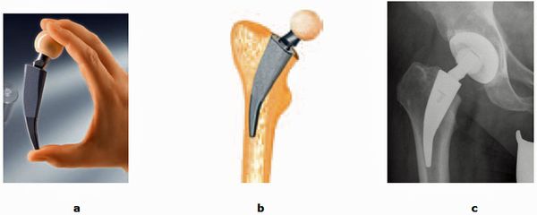 Abb.:1 a Kurzschaftprothese b Verankerung im Knochen c Röntgenbild