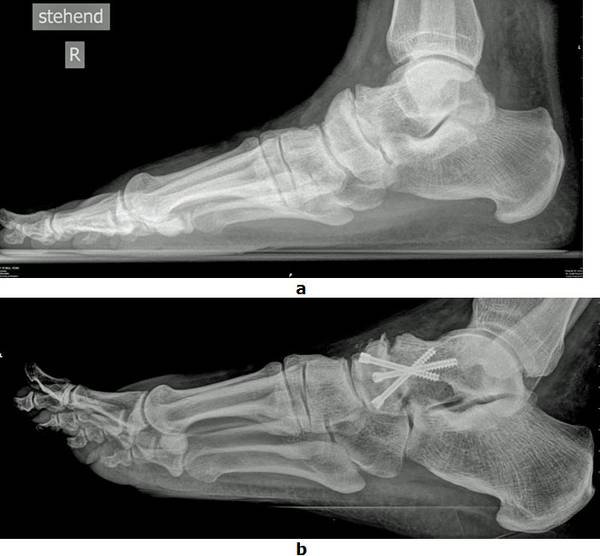 b Isolierte Fusion des kaputten Gelenkes mit 3 Schrauben. Nach der Operation konnte der Patient wieder ohne Hilfsmittel Gehen.