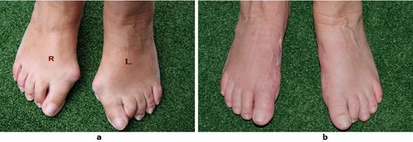 Abb.1: a Fortgeschrittene Hallux valgus Fehlstellung. Die Großzehe ist verdreht und verdrängt die zweite Zehe. Der Vorfuß ist verbreitert.