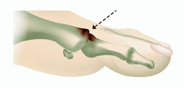 Abb.5: Großzehengrundgelenk mit Arthrose und Knochenanbauten. Die mit dem Pfeil markierten Anbauten werden bei der Cheilektomie abgetragen.