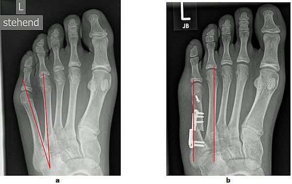 b Die Knochenachsen sind wieder parallel und der Vorfuß verschmälert.