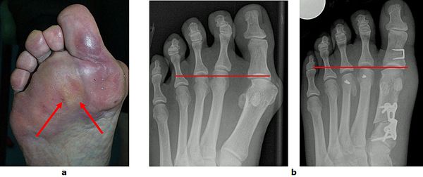 Abb.9: a Fixierte Krallenzehenfehlstellung mit Clavus (Hühnerauge).